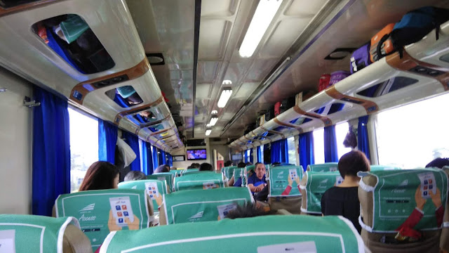 Pociąg nie jest najnowszy ale ma wygodne fotele, dużo miejsca na nogi, gniazdo, jest telewizor, toaleta, stoliki i co 10 minut chodzi stewardesa od której można kupić jedzenie i napoje. Za dodatkowy posiłek trzeba zapłacić 8 zł, za herbatę 1.5 zł więc nie zdzierają.