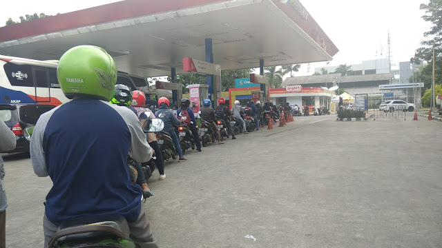 Powszechną praktyką na Indonezyjskich stacjach benzynowych są oddzielne kolejki dla samochodów i motocykli. Na szczęście płaci się przy dystrybutorze więc tankowanie jest szybkie.
