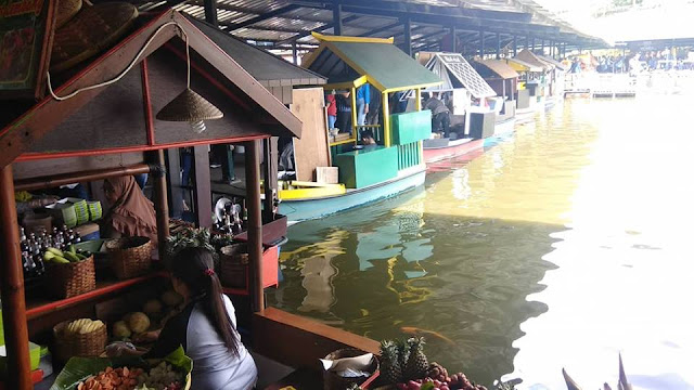 „Floating market” w pobliżu miasta Lembang na Jawie to ciekawe miejsce dla miłośników jedzenia. Jest to dość nietypowy food court, zbudowany wokół jeziora, wzdłuż pomostów cumują małe łódeczki z których każda to miniaturowy bar i to z nich kupuje się jedzenie, a na brzegu jest zadaszenie ze stolikami. Wejście tutaj kosztuje 20 tysięcy rupi (jakieś 5 zł) plus oczywiście opłata przy kupnie jedzenia. Przy łódeczkach nie płaci się gotówkową ale żetonami które kupuje się przy wejściu. W cenię biletu wstępu wliczony był kupon na jeden kubek darmowego napoju, do wyboru – mrożona kawa, mrożona herbata lub sok pomarańczowy.