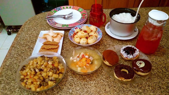 Dziś tak mnie zaskoczyła: pikantne ziemniaczki z wątróbką marynowane w trawie cytrynowej, zupa z kurczaka, jajka w pikantnym sosie balado, krakersy krewetkowe, tempeh czyli placki z soi poddanej fermentacji oraz ryż, bo jak to mówią w Indonezji „tidak makan nasi, belum makan” – „jak nie zjadłeś ryżu to jakbyś nie jadł wcale”. Jedynie pączki są kupne, cała reszta to w 100% domowa, indonezyjska kuchnia.